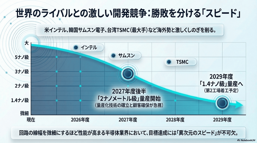 市場は2025年前半の試作ライン稼働、2027年の量産開始目標を注視しています。しかし、最大のリスクは競合との時間差です。ラピダスが1.4ナノ級量産および本格稼働を目指す**「2029年度」**に対し、インテルやサムスン電子といった世界的巨人は、2027年の量産開始を見込んでいます。