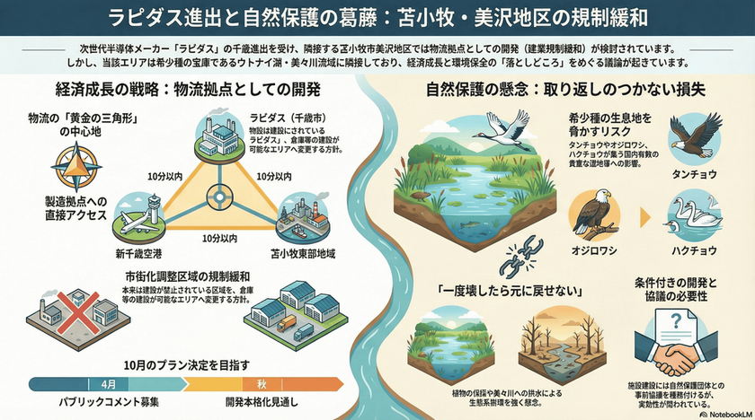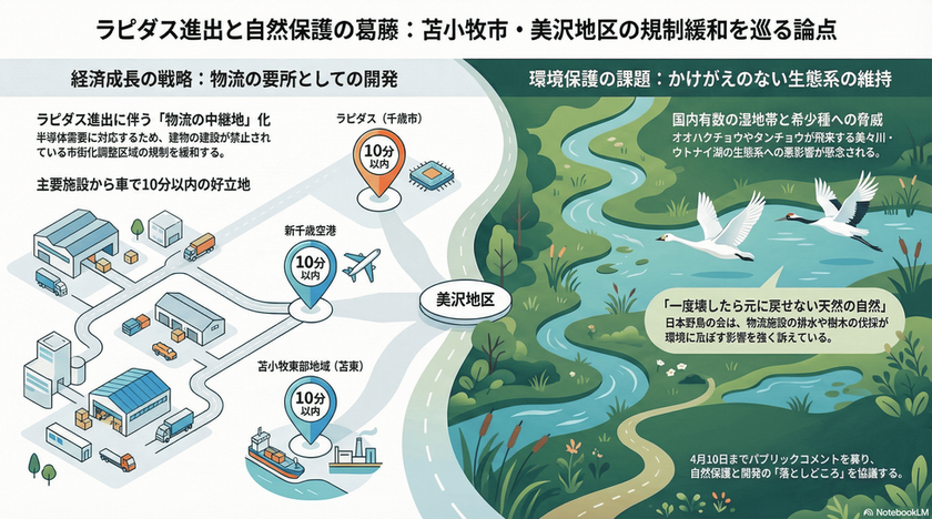 ■ 乗り越えるべき「自然との共生」という壁 ただ、もちろん良いお話ばかりではありません!このエリアのすぐそばには、ラムサール条約にも登録されている「ウトナイ湖」や「美々川」があって、白鳥やオジロワシなどの希少な野鳥が集まる大自然の宝庫なんです。 そのため、日本野鳥の会などの自然保護団体からは、「物流施設ができたら生態系に影響が出ちゃう!」「一度壊した自然は元に戻せない!」と、とっても強い懸念の声が上がっています。